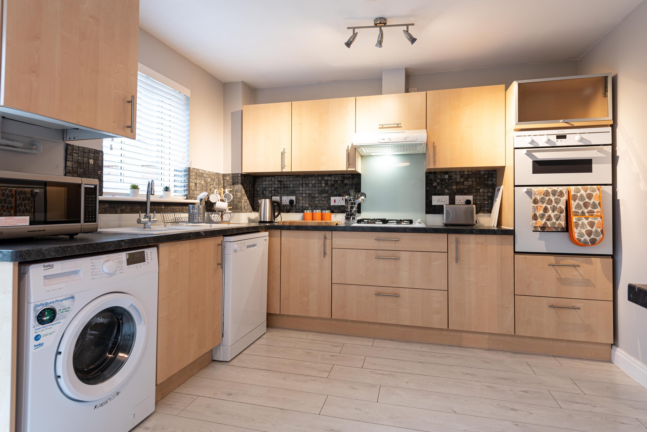 Enjoy the open Plan kitchen dining space, with an abundance of light. The Kitchen is equipped with plenty storage space, two fridge freezers, washing machine , dining table and chairs & a Wall mounted TV.